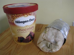 Half-gallon of ice cream, super veggie burrito, chips. ~ 2500 calories